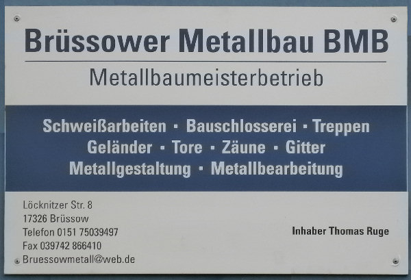 Das Unternehmen, Brüssower Metallbau BMB, wurde am 15.07.2014 gegründet, der Sitz ist in der uckermärkischen Stadt Brüssow, gelegen zwischen Pasewalk und Prenzlau.